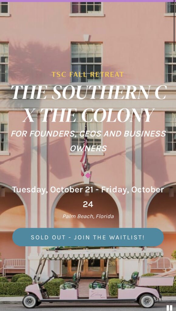 The Southern C is headed to Palm Beach and the iconic Colony Hotel this week to a sold out retreat for founders, CEOs and business owners. TSC co-founders Whitney Long and Cheri Leavy have partnered up with Sarah Wetenhall, the “captivating CEO of the Colony Hotel in Palm Beach” to plan this incredible retreat for 75 lucky attendees. I had the pleasure of hearing Sarah speak both at The Southern C retreat a couple of years ago and in Birmingham, Alabama at The Antiques at the Gardens event and she is a warm, engaging and inspirational speaker. I absolutely loved hearing the story of her family’s connection and ultimate ownership of The Colony. In addition to Sarah, The Southern C Retreat Itinerary includes an incredible lineup of speakers, activities and sponsors.